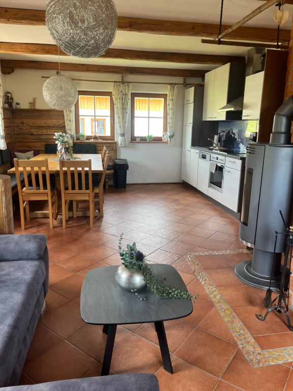 Ausstattung des Chalets: Kaminofen mit Sichtfenster, Fußbodenheizung im Wohnbereich, Satelliten-TV, 2 Duschen, 2 Kühlschränke mit Gefrierfach, Spülmaschine, Wasserkocher, Küchenutensilien, Backofen, Kochplatten, Toaster, Kaffeemaschine